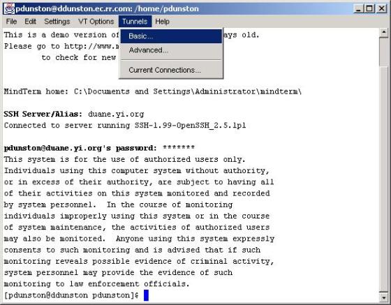 now save it with a .bat extension. Double-click on it. You should be prompted for your login name when MindTerm starts up then type your password. After you are authenticated click on the Tunnels menu and click Basic. You should see the tunnels in the box that opens up. This is an easy way to allow remote users to start up the tunnels without many configurations on their part. They only need to click the .bat file and type their username and password and optionally run vlock. Their client software can be pre-configured for remote profiles that connect to the tunnels automatically.